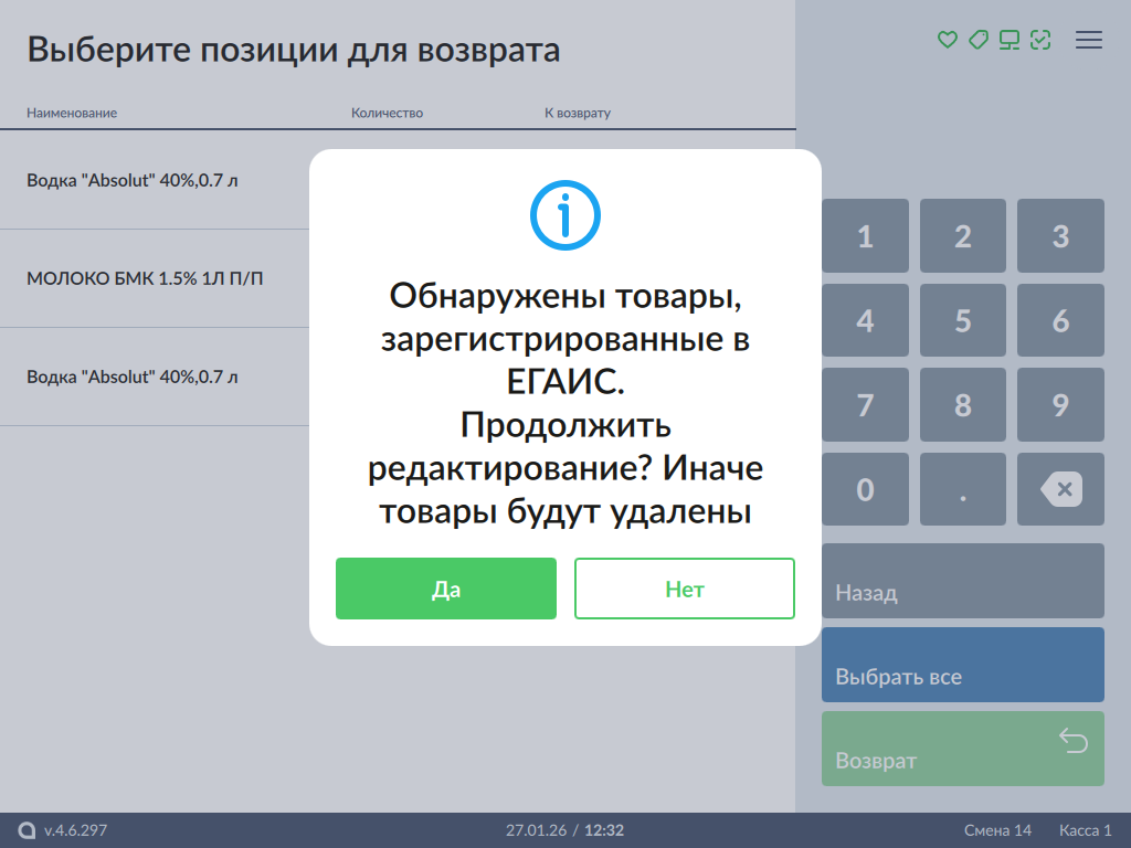 Для перехода к выбору позиций для возврата нажмите "Да". При нажатии "Нет" будет сформирован чек возврата, из которого будут удалены алкогольные товары, которые не были выбраны для возврата.