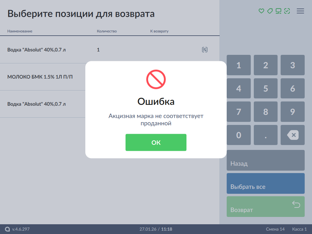Нажмите кнопку "ОК", чтобы закрыть сообщение. Во всех перечисленных случаях алкогольный товар не может быть добавлен в чек возврата. Необходимо обратиться в службу технической поддержки.