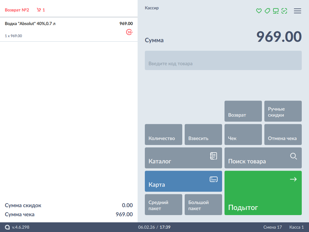 Добавление алкогольных товаров в чек возврата осуществляется аналогично наполнению чека продажи с учетом того, что товар переходит от покупателя в магазин, а покупателю возвращаются деньги. Более подробно о продаже алкогольных товаров можно прочитать в разделе "Продажа алкогольных товаров".
