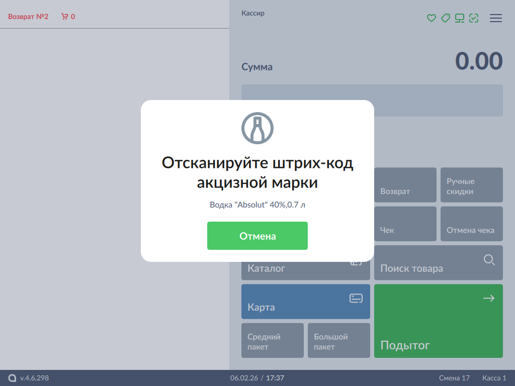 1. После ввода штрих-кода товара на экран будет выведен диалог сканирования штрих-кода акцизной марки: