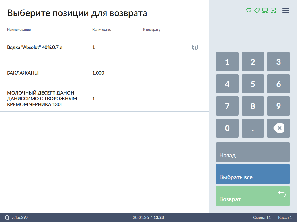1. В окне выбора позиций для возврата отображается полный перечень товаров из чека продажи.