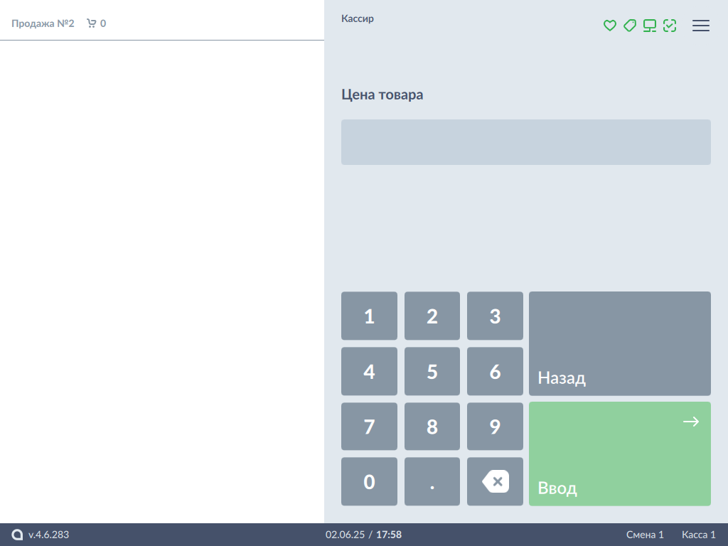 Укажите цену товара и нажмите "Ввод". Для отказа от ввода цены товара вручную нажмите "Назад".Если в свойствах товара задан обязательный ввод цены, то программа запросит ввести цену даже в том случае, если кнопка модификатора "Цена" не была нажата.