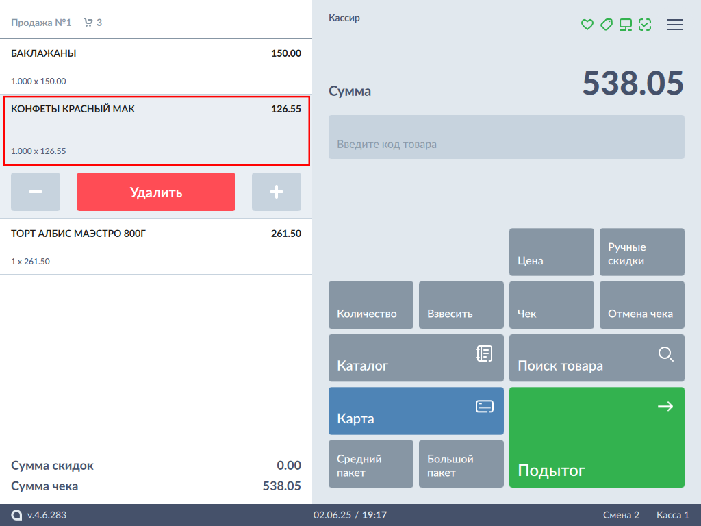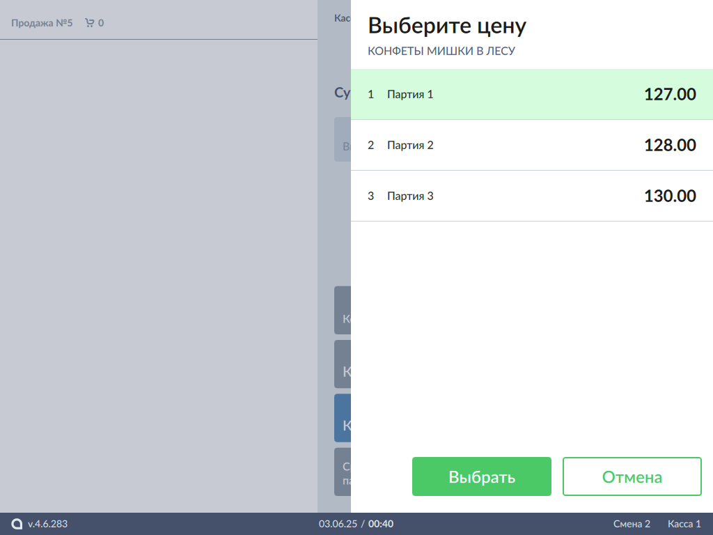 Нажмите кнопку "Выбрать" - товар будет добавлен в чек с выбранной ценой:
