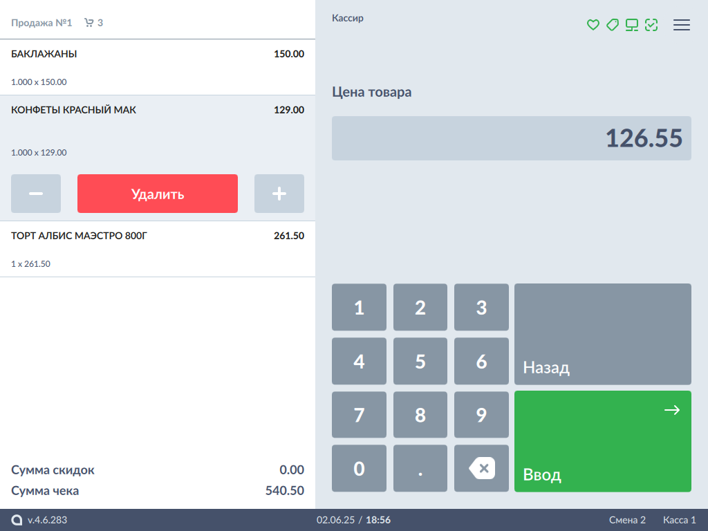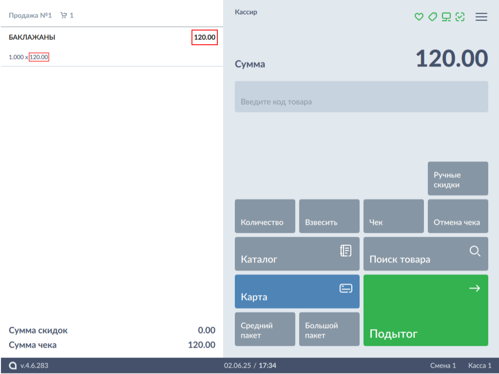 Модификатор "Цена" может быть применен совместно с другими модификаторами (количество, отдел, расфасовка).- Добавьте товар в чек любым доступным способом - значение модификатора "Цена" будет автоматически присвоено добавленному товару.