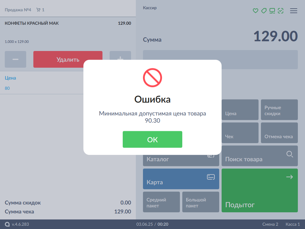 В зависимости от настроек выбор цены также может отображаться при ее увеличении.Если введенная цена меньше допустимой, то при попытке применить модификатор "Цена" на экран будет выведена ошибка: