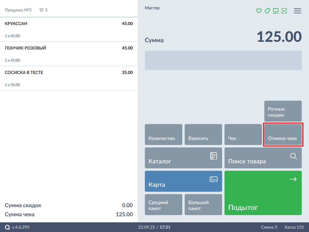 - На экране отобразится сообщение о сторнировании всех позиций чека:
