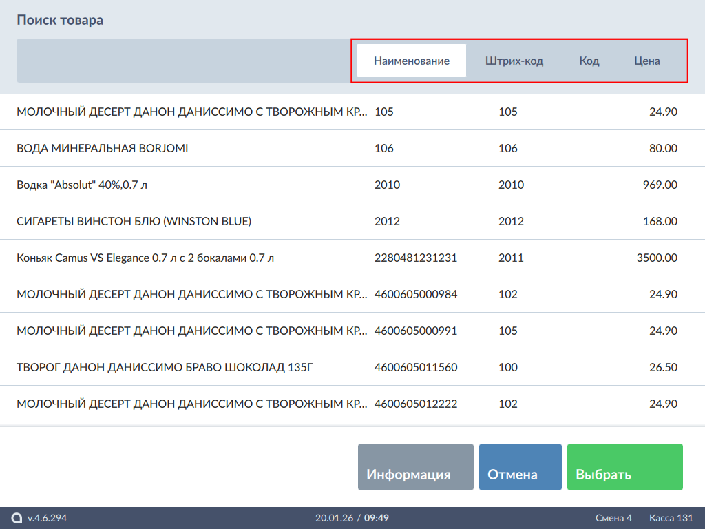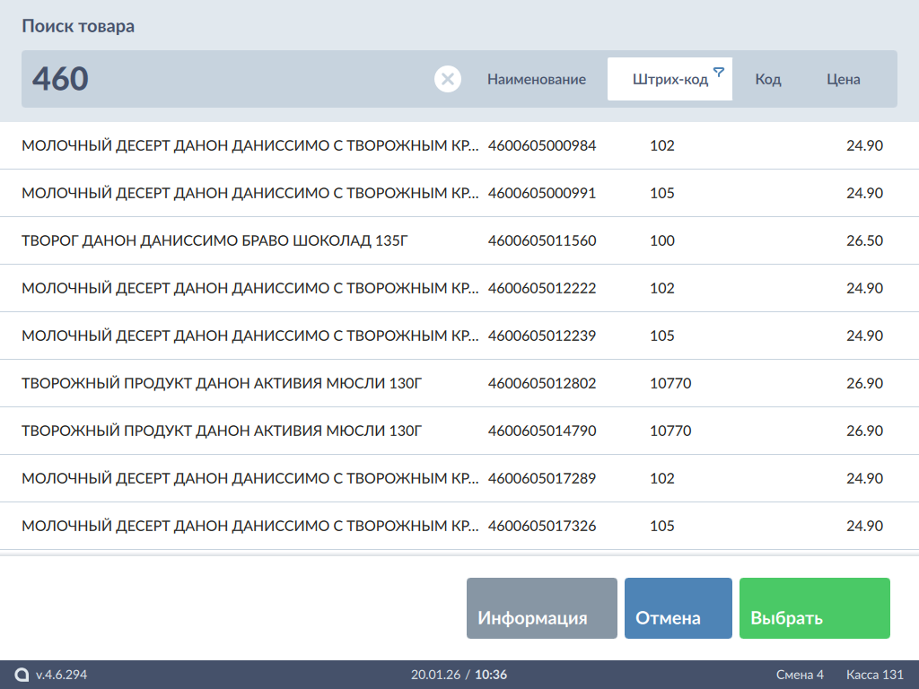Для ввода значения параметра подбора нажмите на поле поиска:При вводе штрих-кода, кода, наименования и/или цены в списке останутся товары, параметр которых начинается с набранной комбинации: