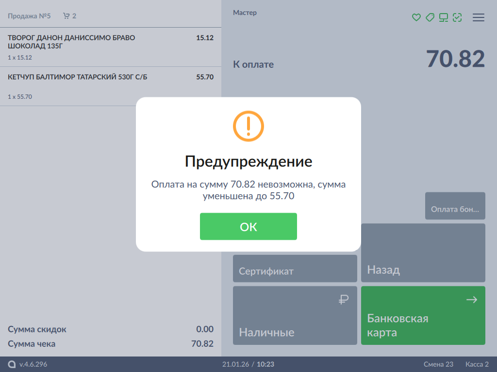 При попытке оплатить весь документ одним способом оплаты на экран будет выведено предупреждение: