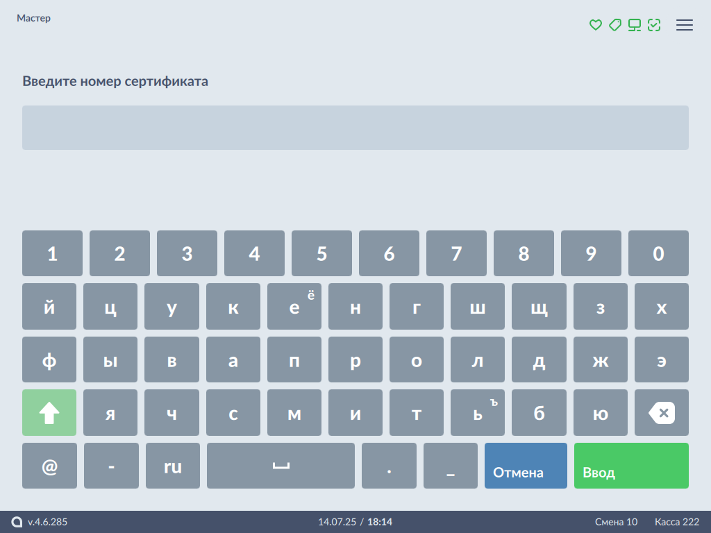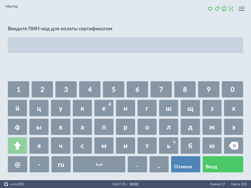 Настройками программы может быть предусмотрен запрос ПИН-кода при оплате чека сертификатом. Необходимо ввести ПИН-код и нажать кнопку "Ввод".