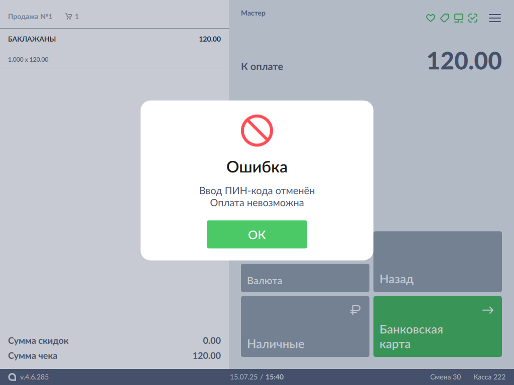 Нажмите кнопку "ОК", чтобы закрыть сообщение. - Если при незаполненном ПИН-коде нажать кнопку "Ввод" или на этапе ввода ПИН-кода нажать клавишу "Отмена", то оплата чека сертификатом будет невозможна. На экран будет выведена ошибка: