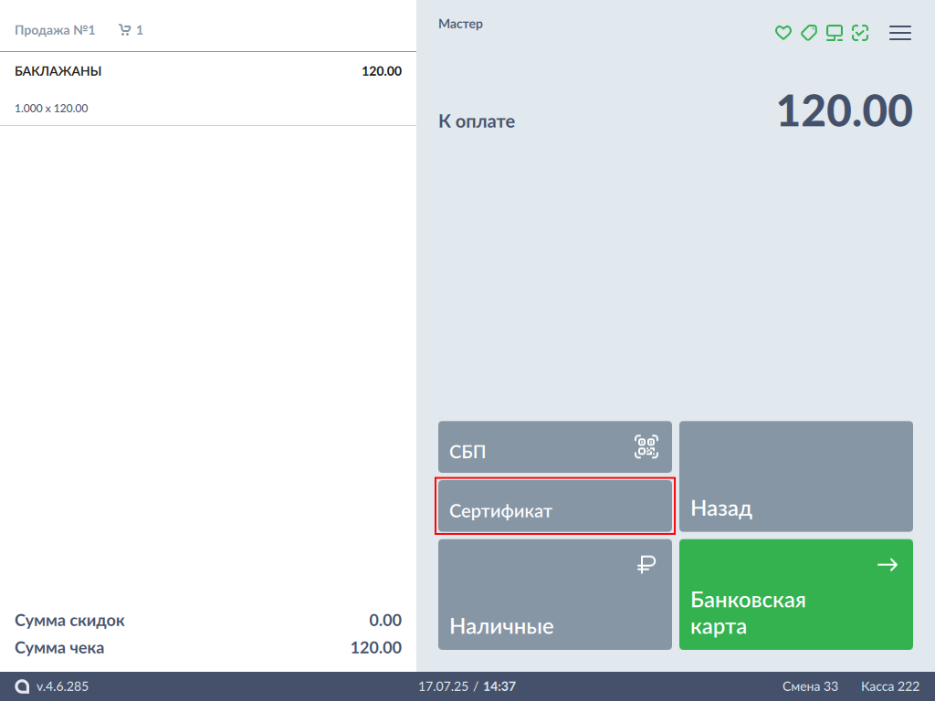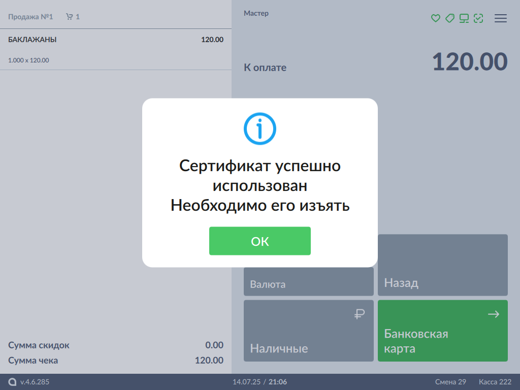 На экран будет выведено сообщение о том, что оплата сертификатом была осуществлена, произошло полное списание средств, сертификат необходимо изъять у покупателя: