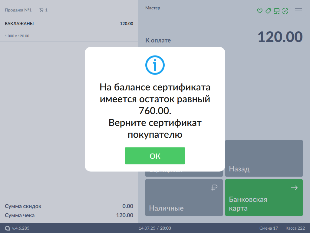 Сертификат необходимо вернуть покупателю. Для продолжения работы нажмите кнопку "ОК".Настройками программы может быть предусмотрено скрытие баланса сертификата.