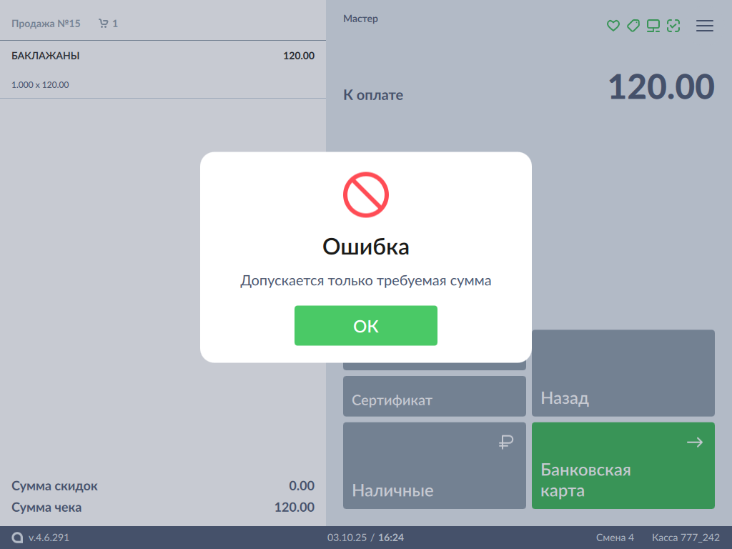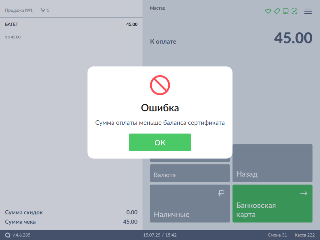 Нажмите кнопку "ОК", чтобы закрыть сообщение. На экран будет выведено окно ввода номера сертификата для повторной попытки оплаты. - Настройками программы может быть установлен запрет на оплату сертификатом с полным списанием. В таком случае, если сумма чека меньше баланса сертификата, то на экран будет выведена ошибка: