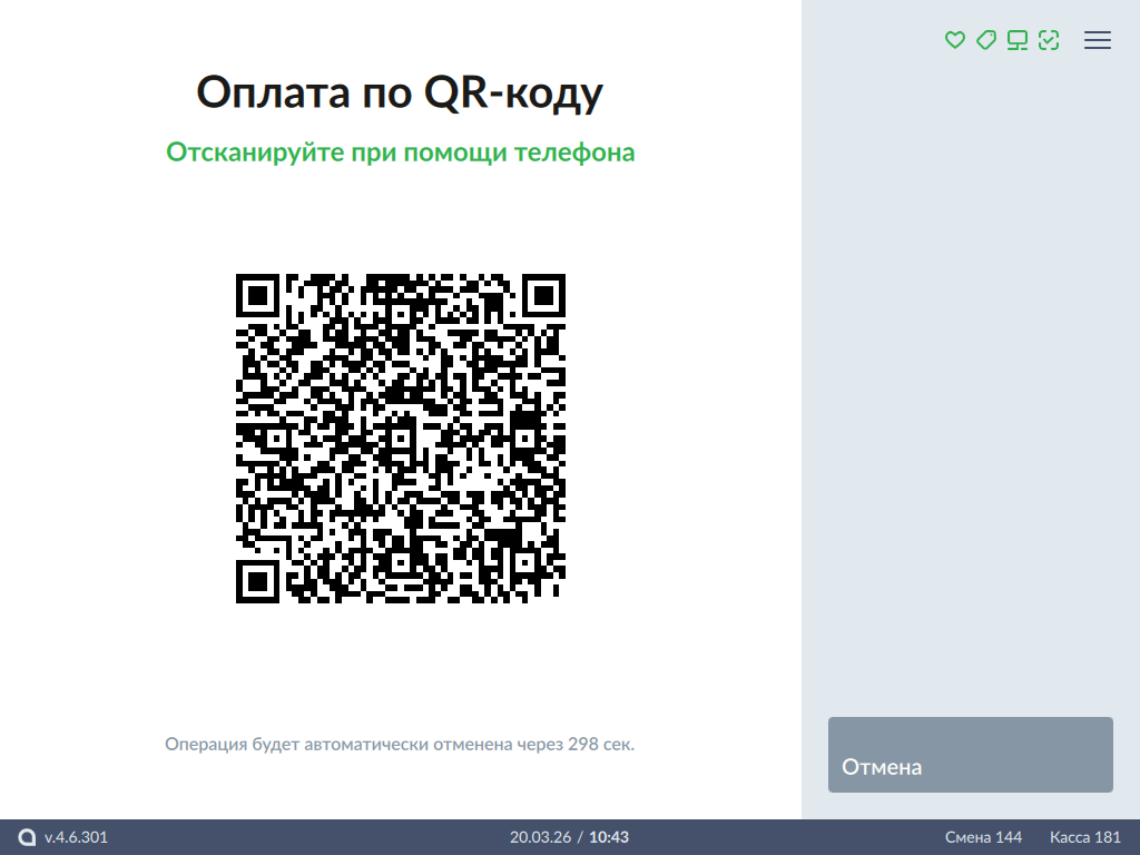 Покупателю необходимо отсканировать QR-код и подтвердить операцию в клиентском приложении. Для отмены операции нажмите кнопку "Отмена".