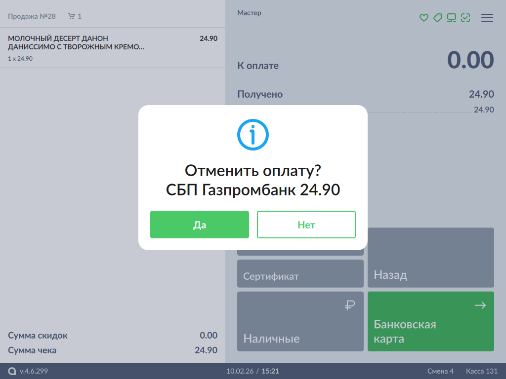 - В режиме подытога выберите тип оплаты "СБП Газпромбанк":
