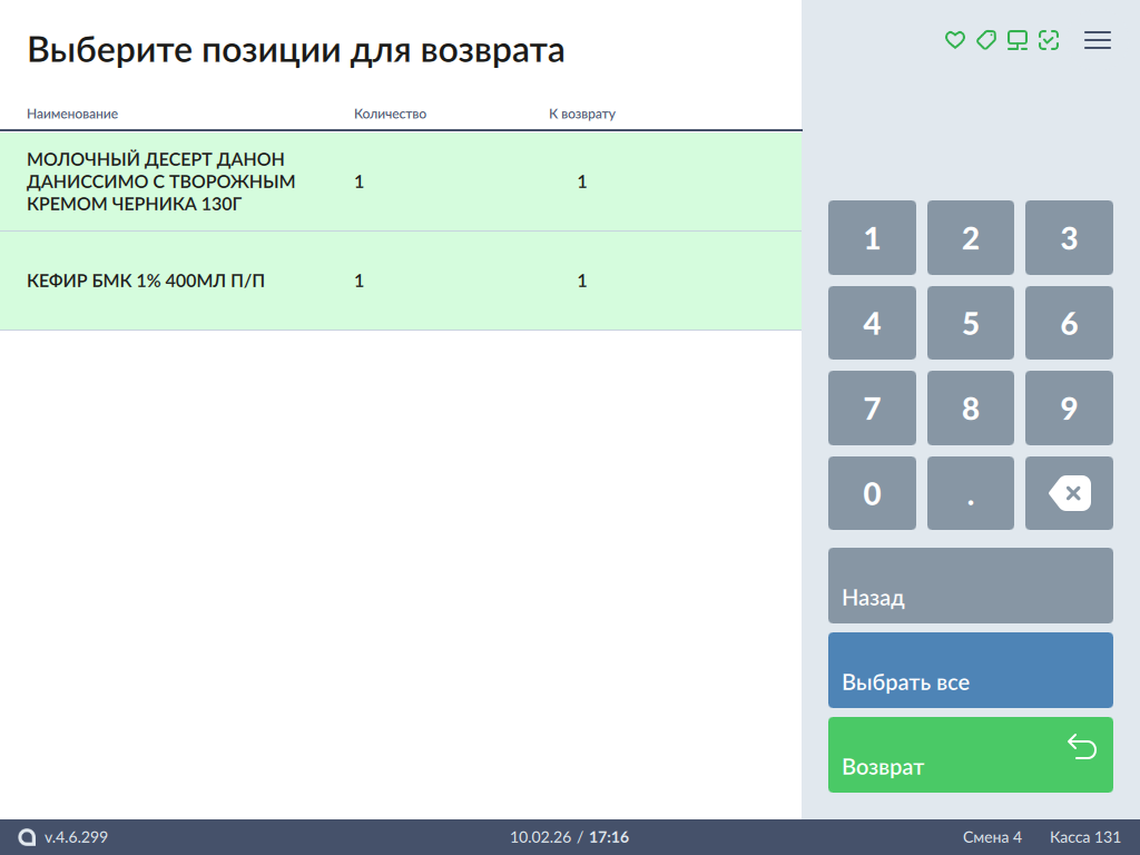 - Нажмите кнопку "Выбрать все" или выберите необходимые позиции для возврата. После выбора позиций нажмите кнопку "Возврат":
