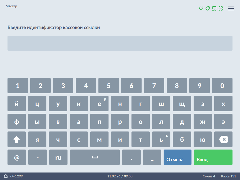 Отсканируйте идентификатор кассовой ссылки или введите его вручную и нажмите "Ввод": - Если регистрация кассовой ссылки была произведена успешно, то на экран будет выведено сообщение, полученное от банка: