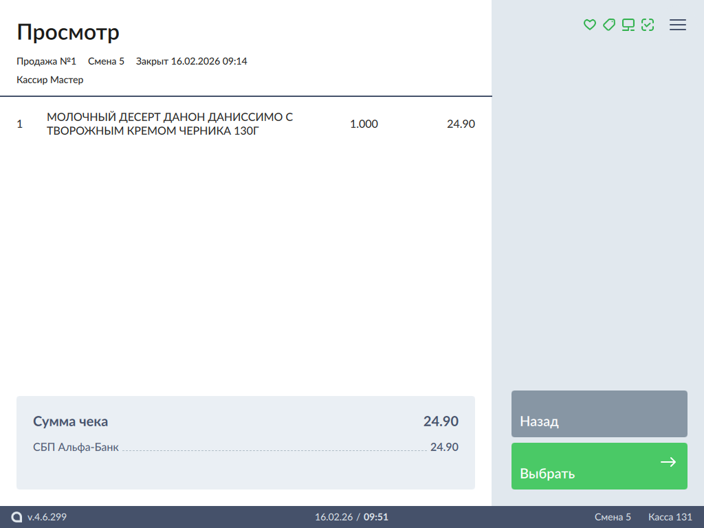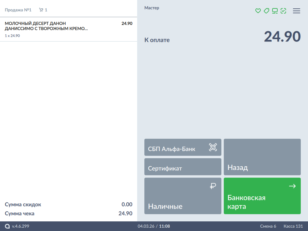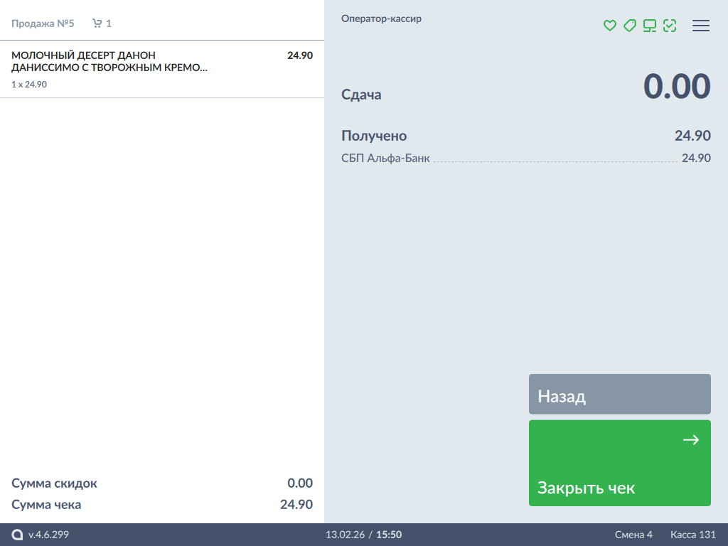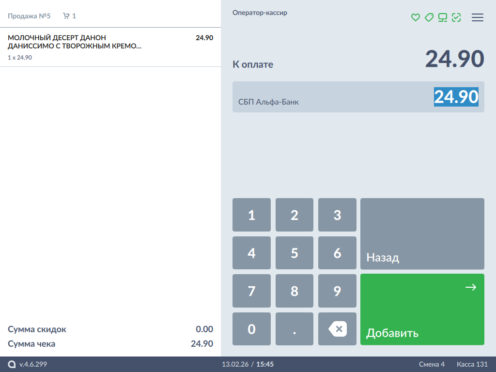 В режиме подытога выберите тип оплаты "СБП Альфа-Банк":