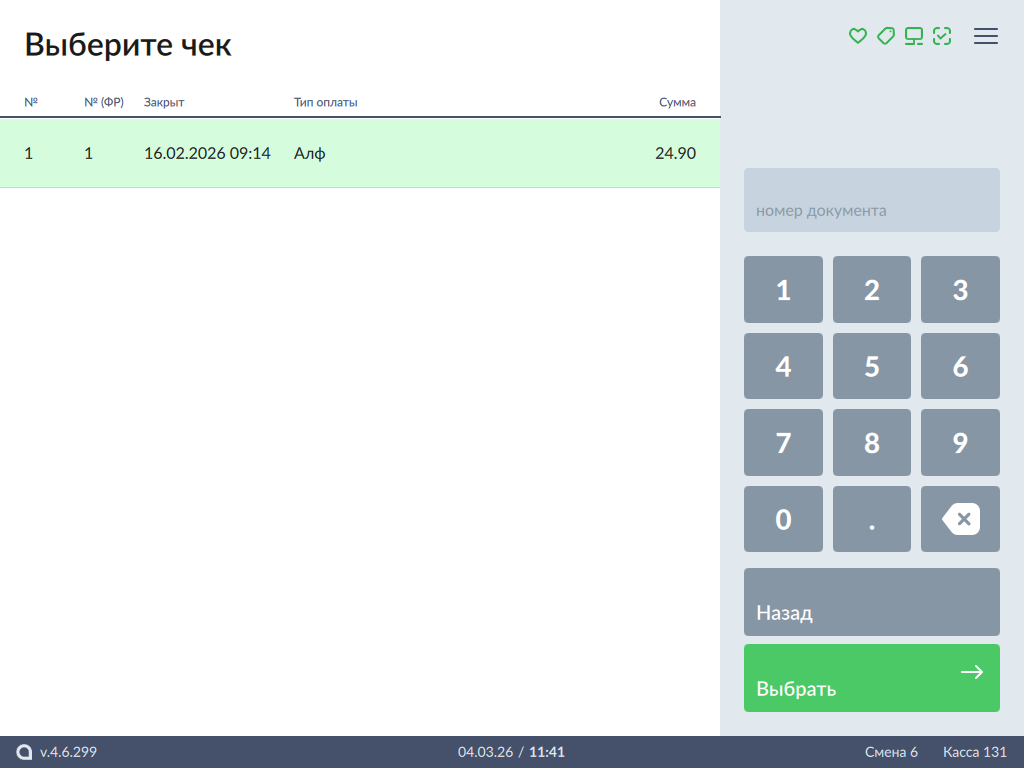 - После выбора чека для возврата на экран выводится полная информация по документу продажи: