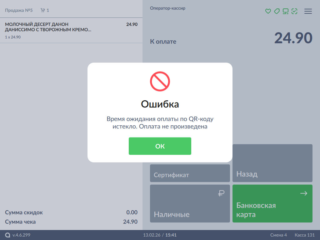 Оплата товара через СБП Альфа-Банк может производиться полностью или частично, если требуется использование нескольких типов оплаты в чеке (например, покупатель не имеет достаточного количества наличных или средств на карте для оплаты полной суммы чека). Запрещено применение оплаты через процессинг СБП Альфа-Банк в чеках возврата, следует использовать возврат по чеку продажи.