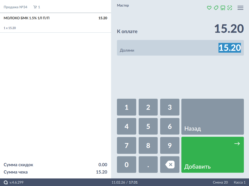 Оплата товара через "Долями" может производиться полностью или частично, если требуется использование нескольких типов оплаты в чеке (например, покупатель не имеет достаточного количества наличных или средств на карте для оплаты полной суммы чека).