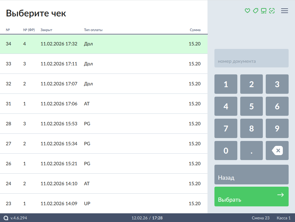 - Выберите чек продажи и нажмите кнопку "Выбрать":