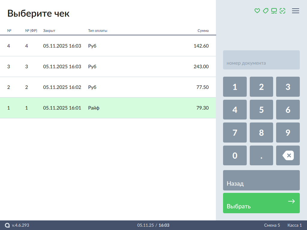 - Выберите чек продажи и нажмите кнопку "Выбрать":