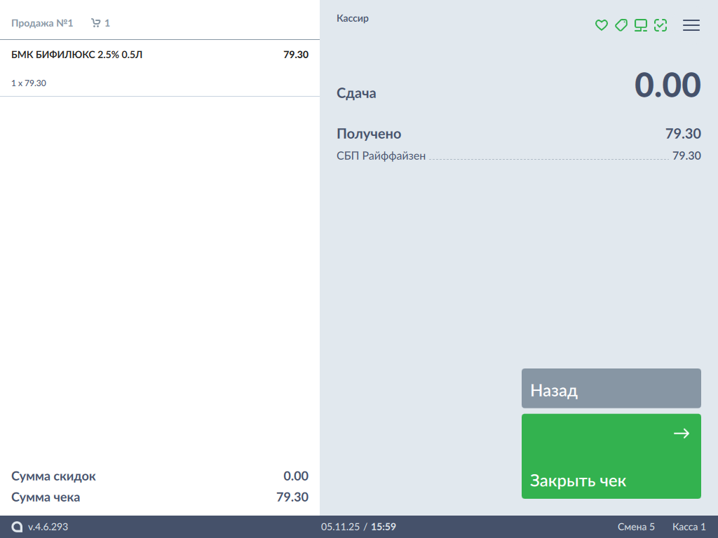 Для закрытия чека нажмите кнопку "Закрыть чек".