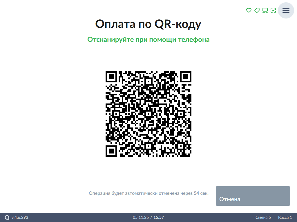 Покупателю необходимо отсканировать QR-код и подтвердить операцию в клиентском приложении. Для отмены операции нажмите кнопку "Отмена".