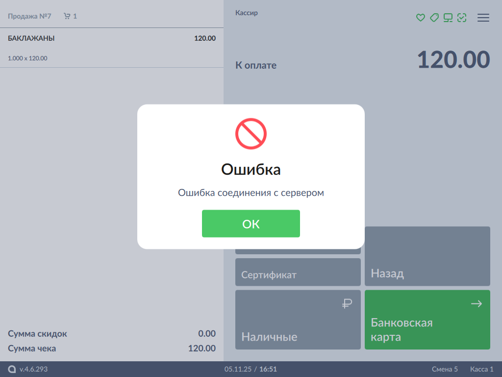 Нажмите кнопку "ОК", чтобы закрыть сообщение. - Если во время отмены оплаты сервер недоступен, то на экран будет выведена ошибка: