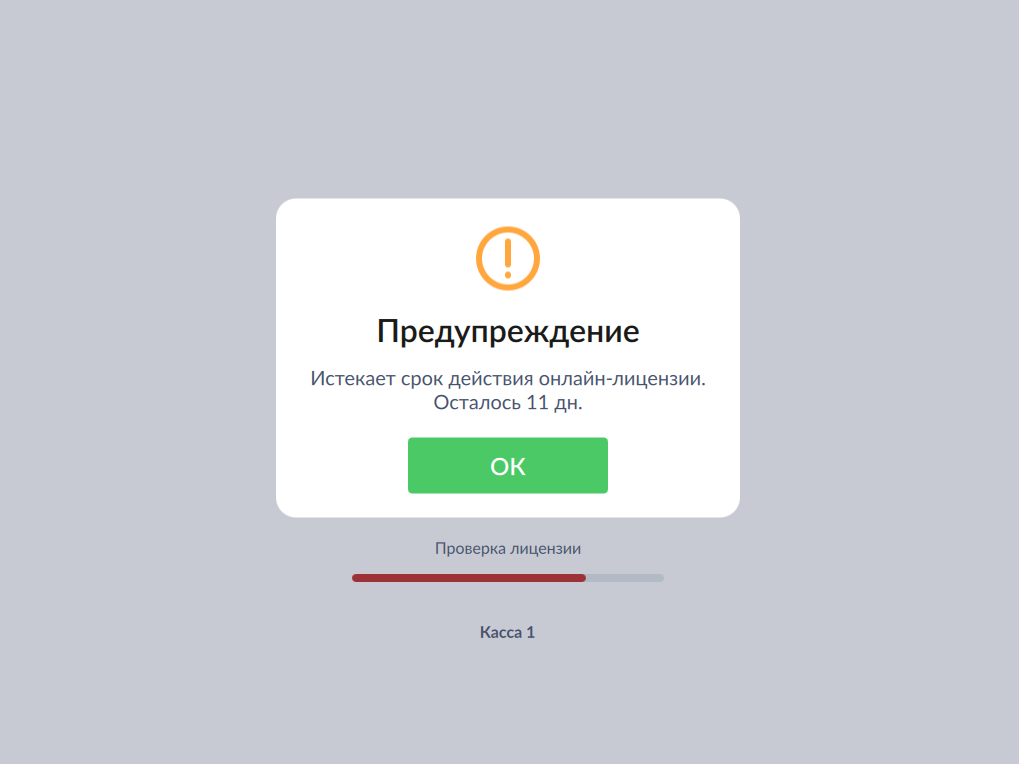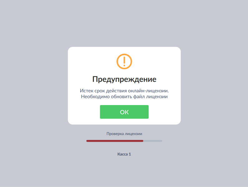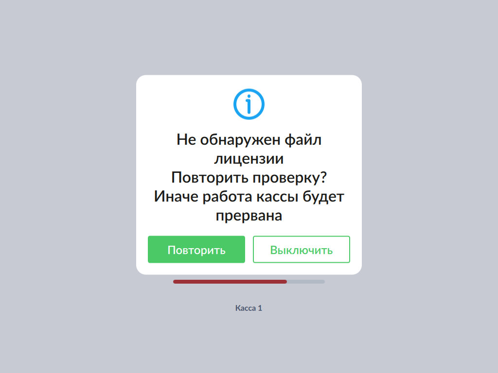 При нажатии кнопки "Повторить" кассовая программа повторно проверит наличие лицензии. При нажатии кнопки "Отмена" касса перейдет к завершению работы: