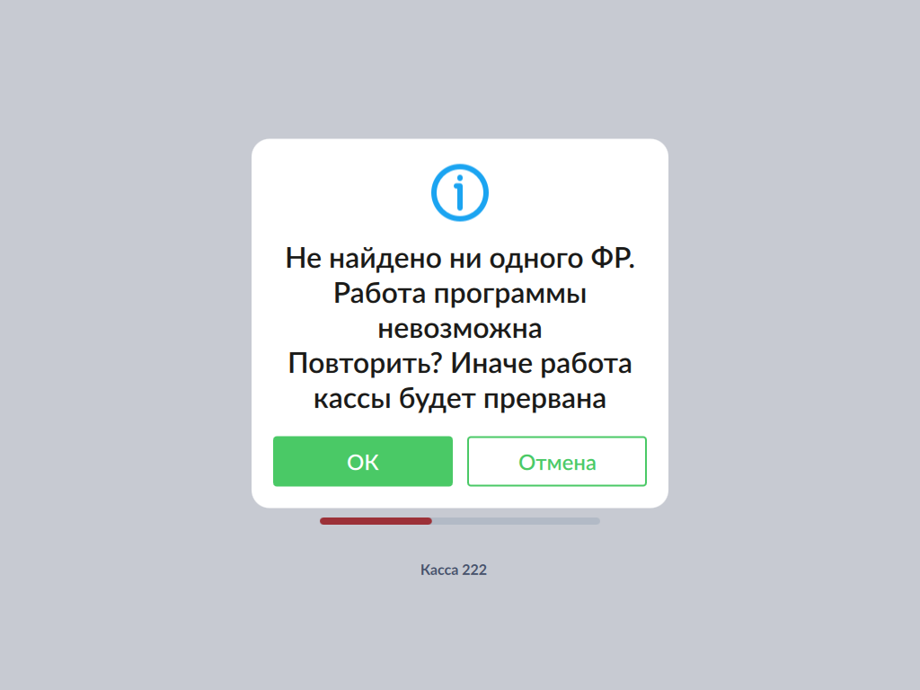 Проверьте подключение к ФР и нажмите кнопку "ОК". Если программа обнаружит необходимое оборудование, то загрузка будет завершена. Если подключить ФР невозможно, нажмите кнопку "Отмена", программа перейдет к завершению работы: