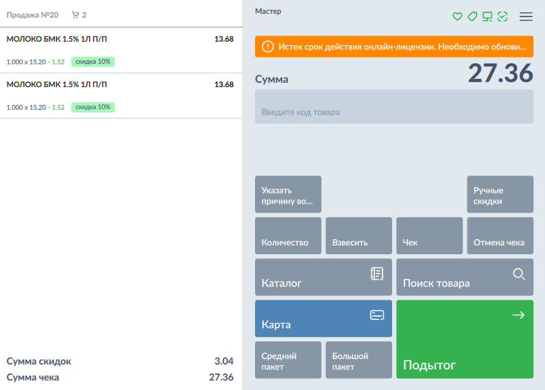 При истечении срока действия онлайн-лицензии переход в демо-режим не осуществляется. Касса работает в обычном режиме.