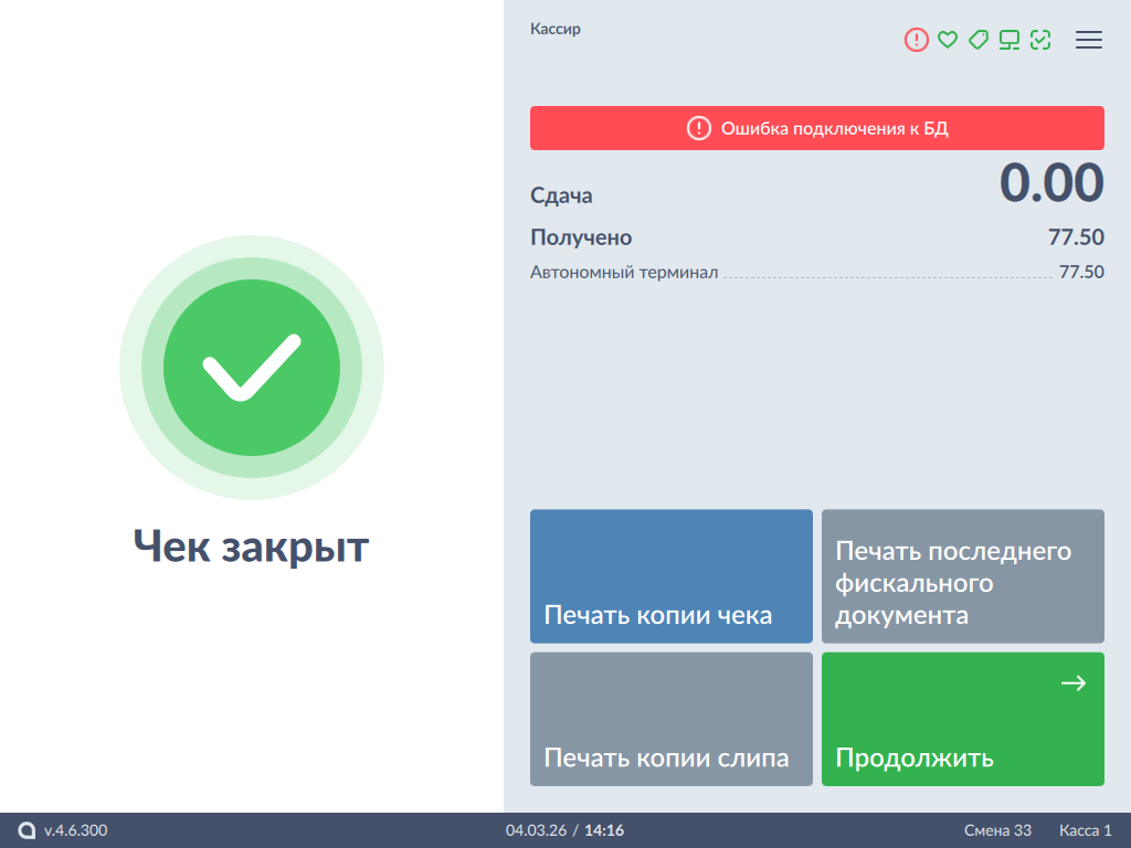 Настройками программы может быть предусмотрена проверка доступности БД после закрытия чека. Если БД недоступна, то на экран будет выведено уведомление: