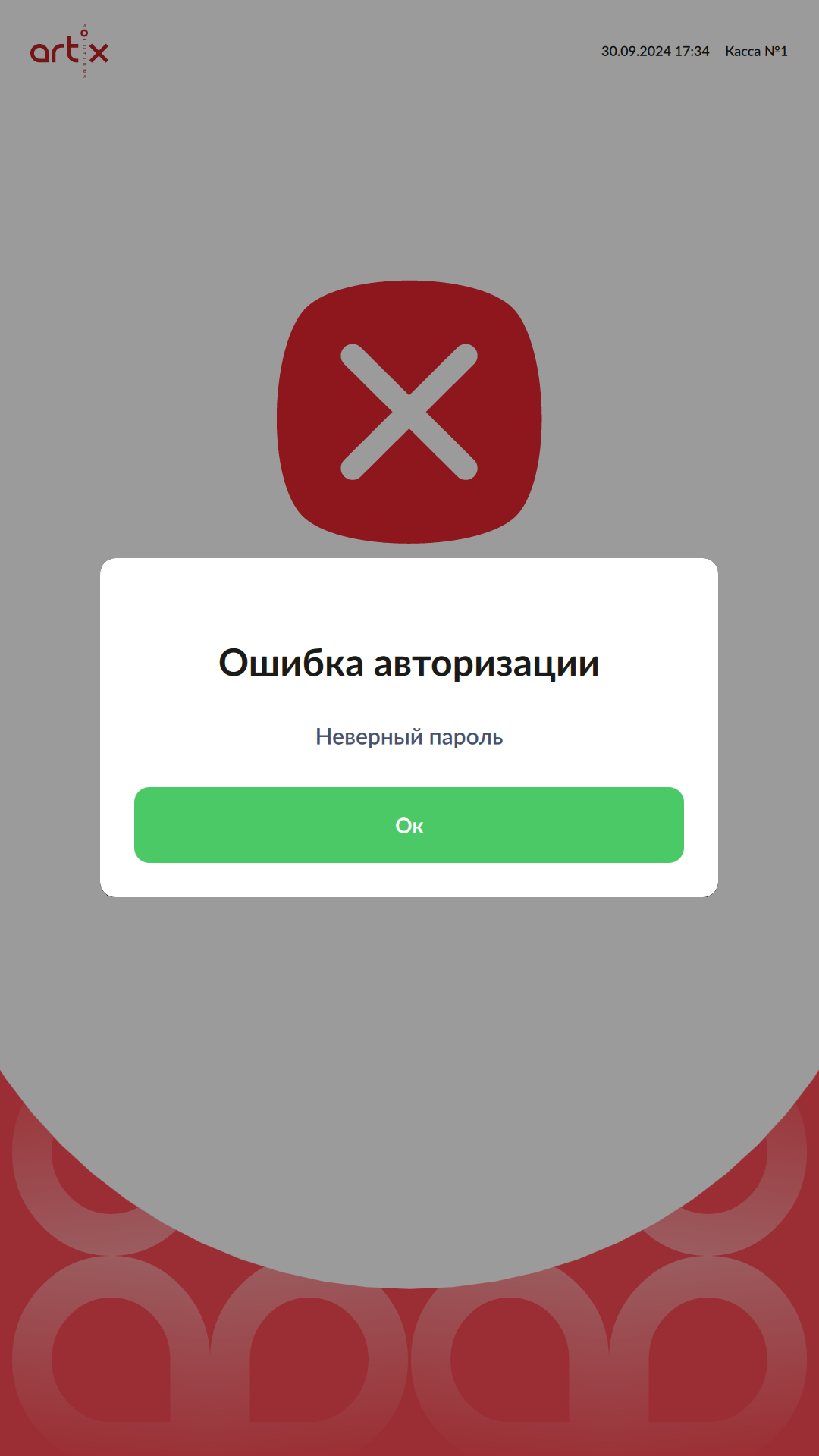 Запуск программы завершается отображением окна блокировки. В заблокированном состоянии лампа активности кассовой линии не светится.