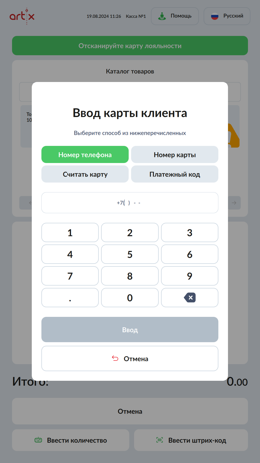 При добавлении карты вручную необходимо подтвердить действие, нажав кнопку "Ввод". Карта будет добавлена в чек.