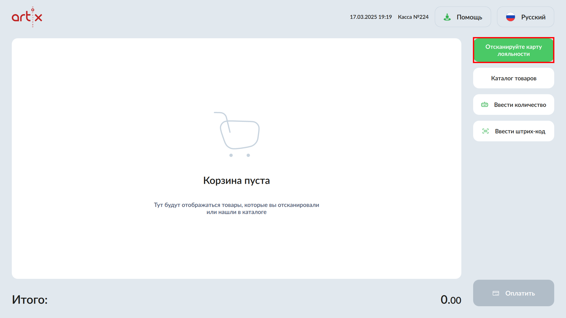Для добавления карты клиента необходимо в формировании чека нажать кнопку сканирования карты лояльности: