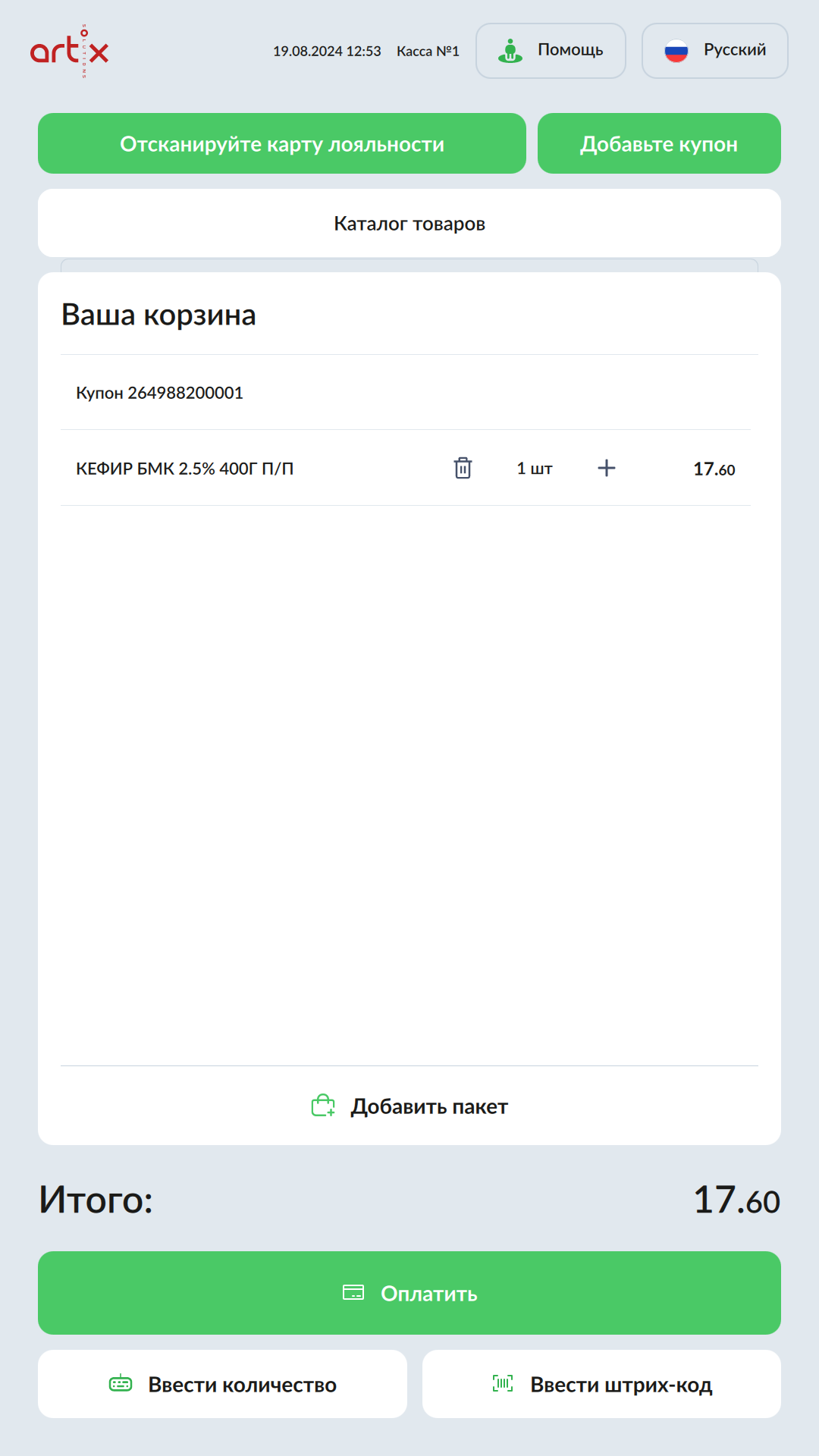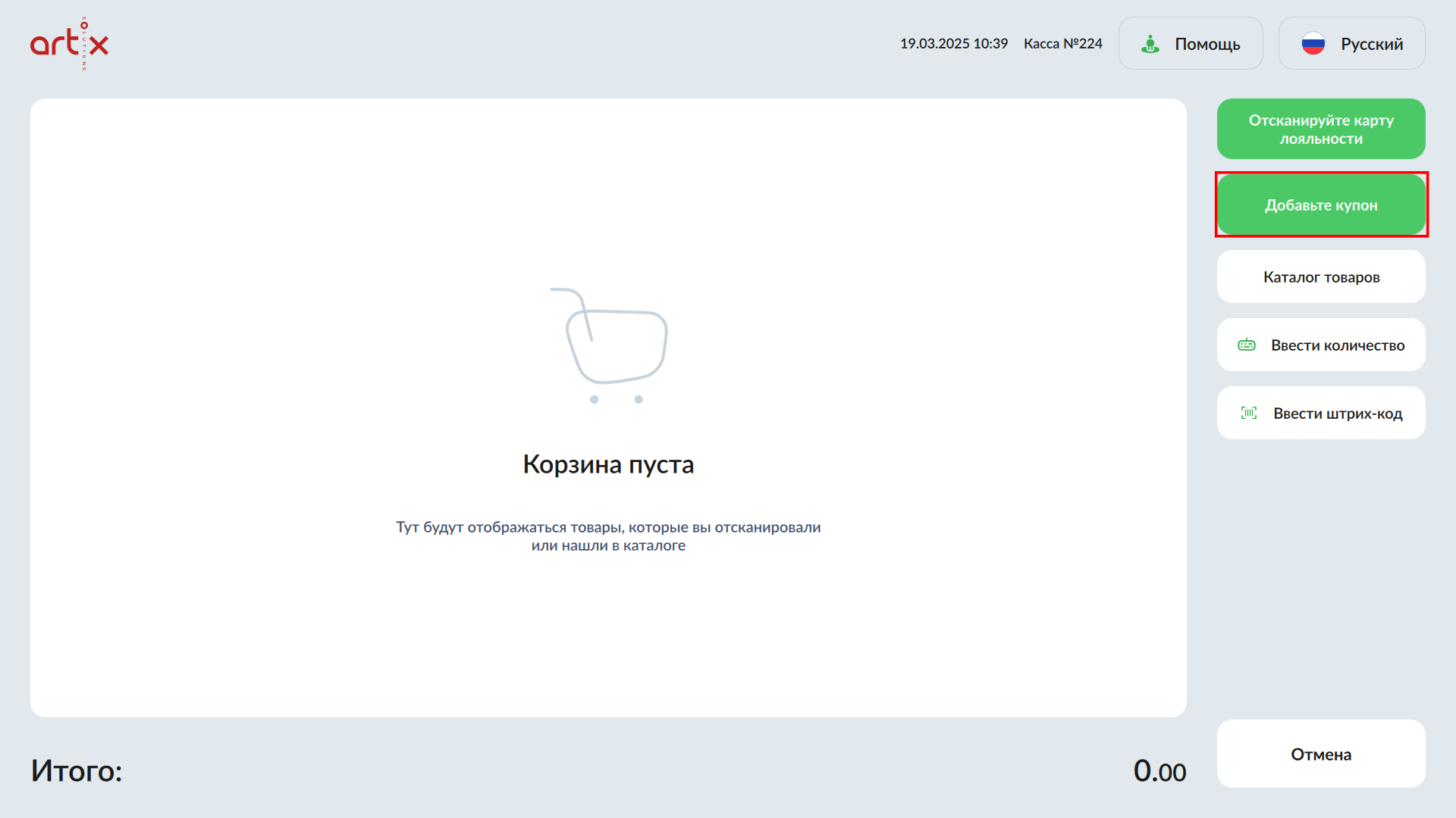 Если добавление купона выполняется вручную, то для подтверждения нажмите кнопку "Ввод". Купон будет добавлен в чек.
