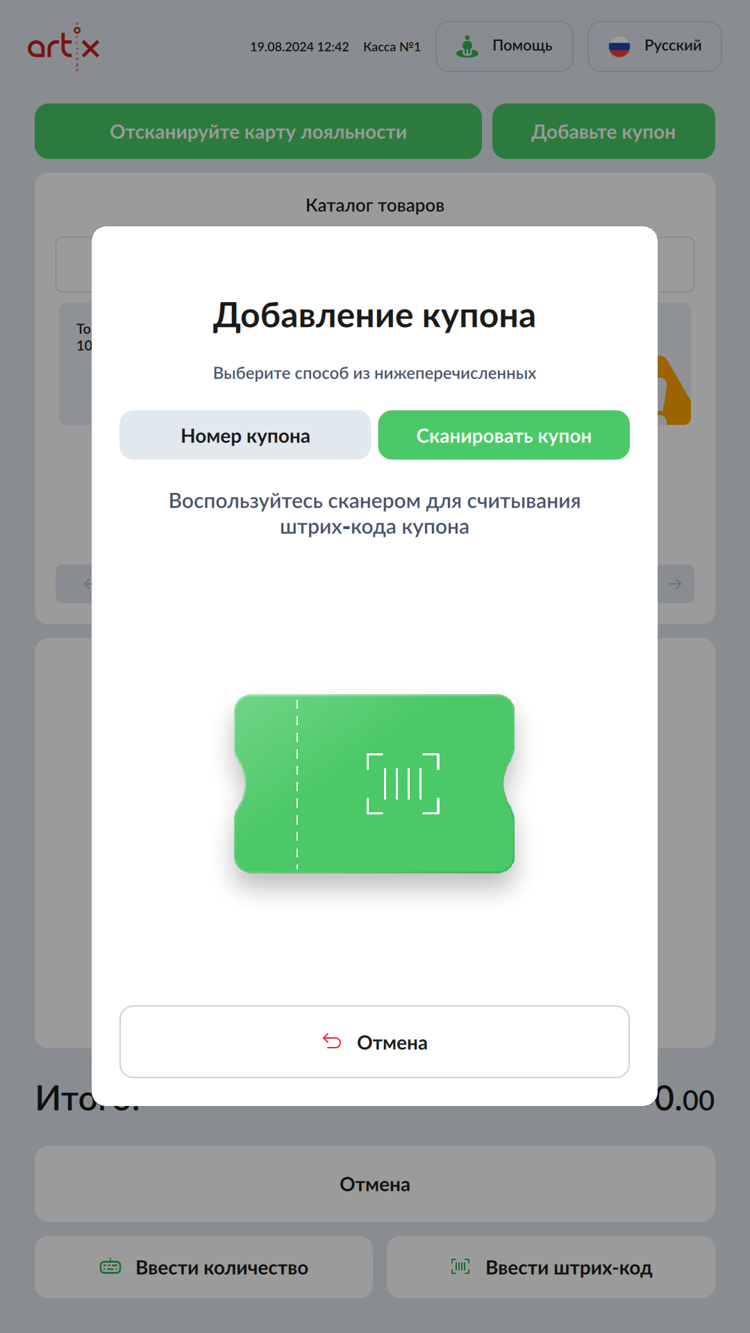 Купон также можно сканировать в окне ручного ввода номера купона.