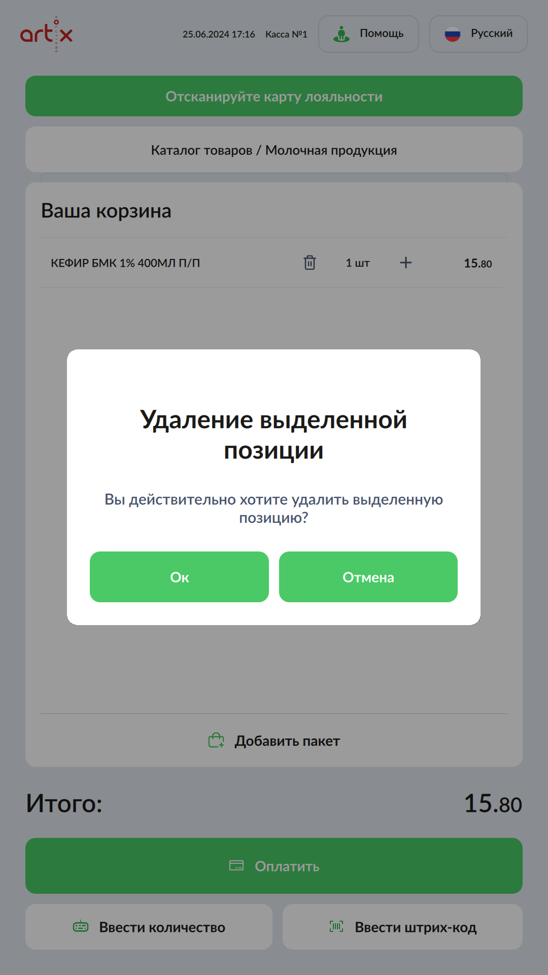 При нажатии на кнопку на экран будет выведен диалог подтверждения удаления товарной позиции из чека: