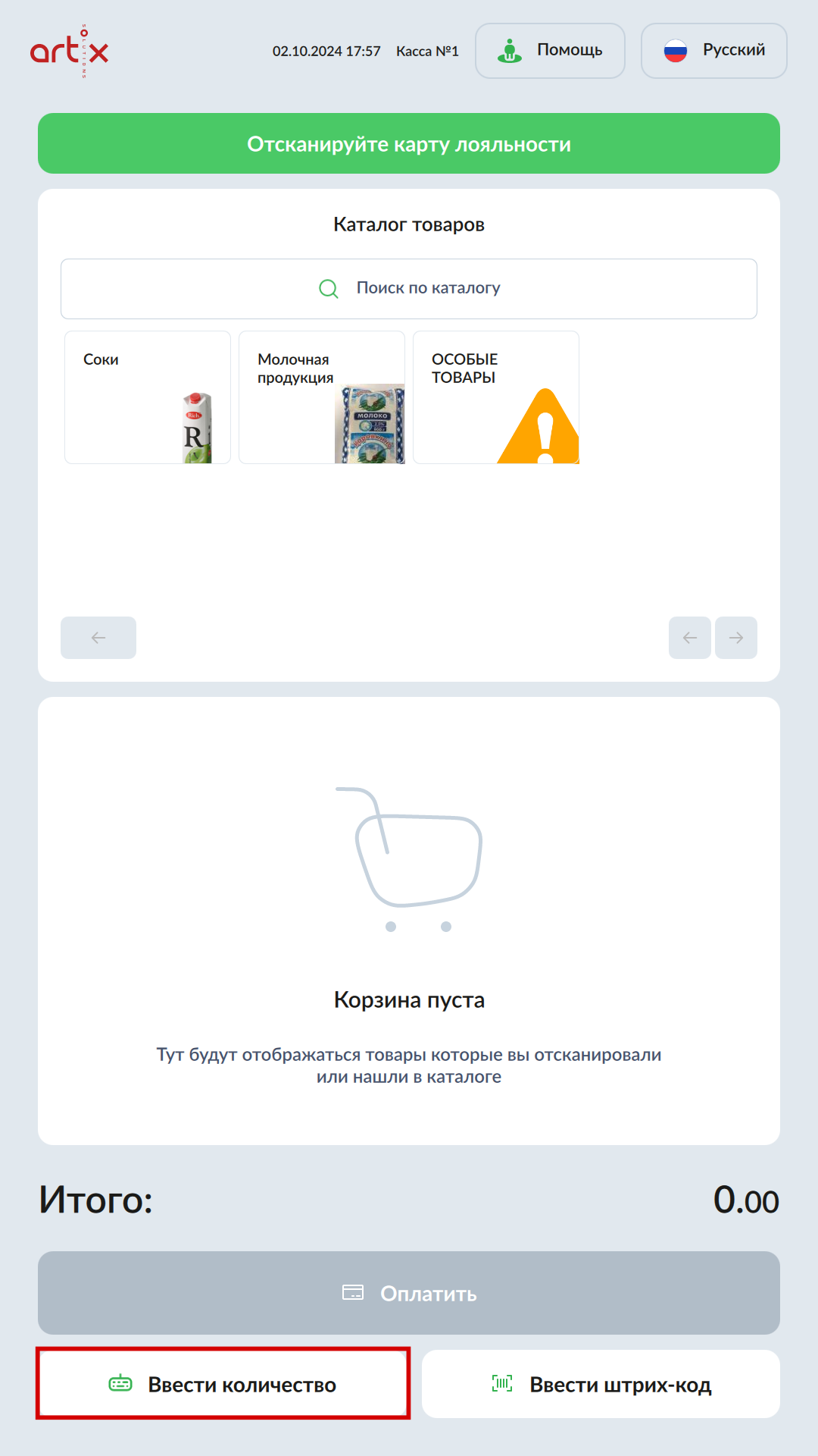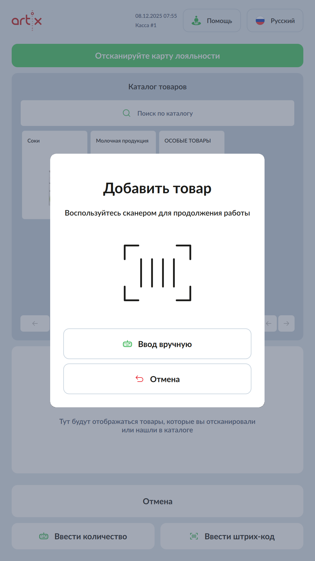 Отсканируйте штрих-код товара или введите вручную.