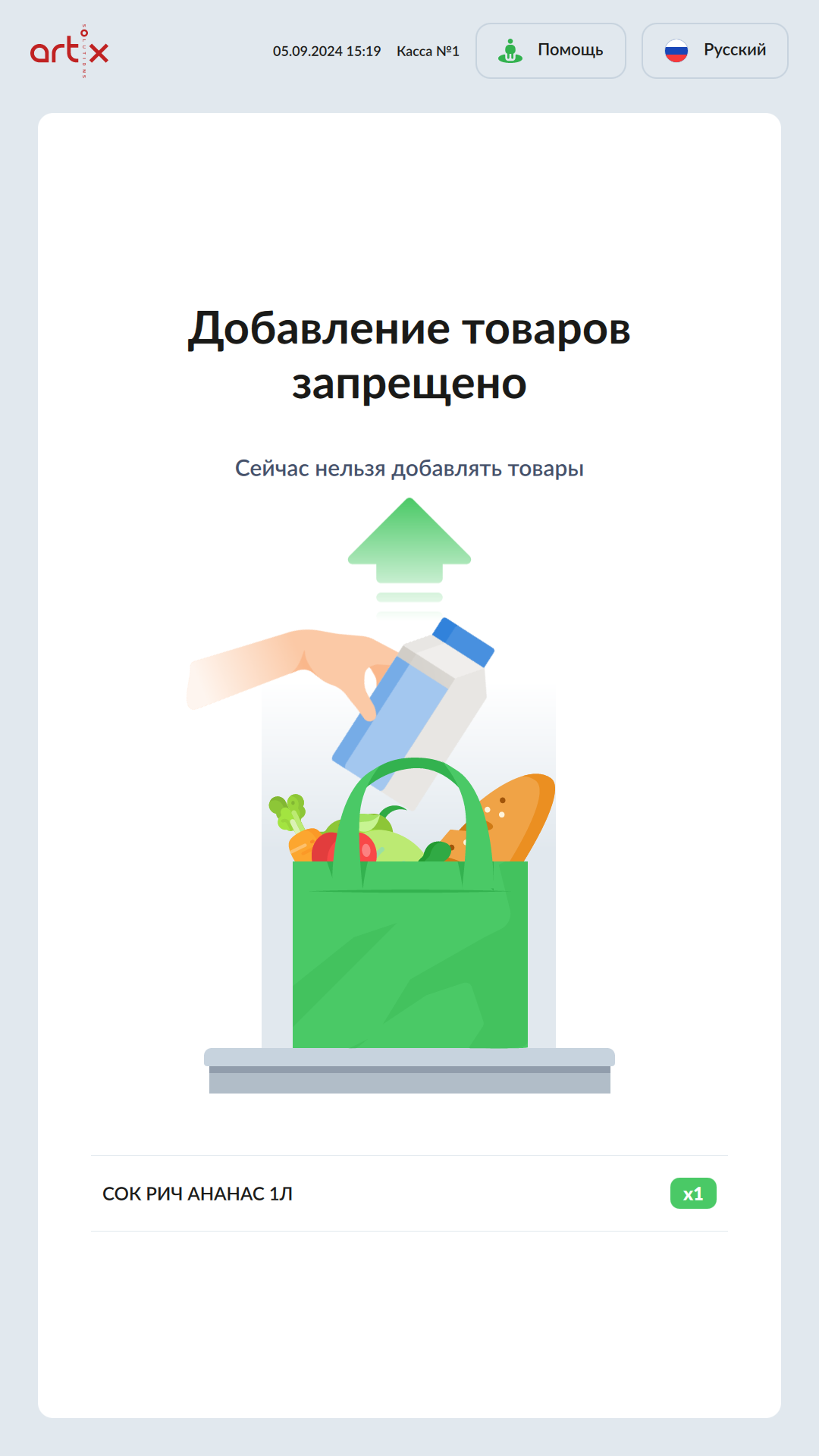 Для исправления ошибки необходимо положить на весы товар, который был отсканирован. Если вес верный, покупка продолжится без ошибок.
