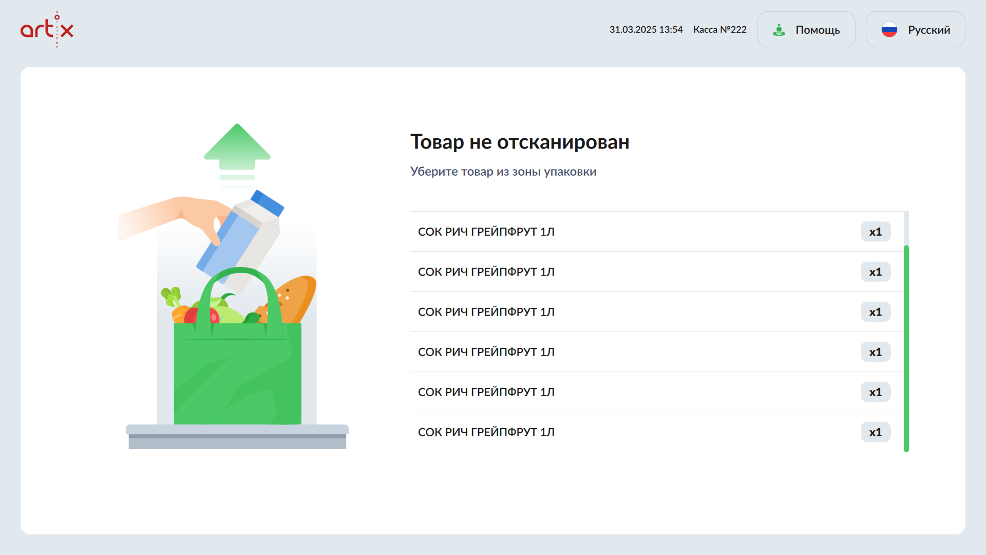 Ошибка может возникать во всех состояниях чека (кроме закрытого чека и взвешивания на контрольных весах) при добавлении товара в зону упаковки без сканирования.