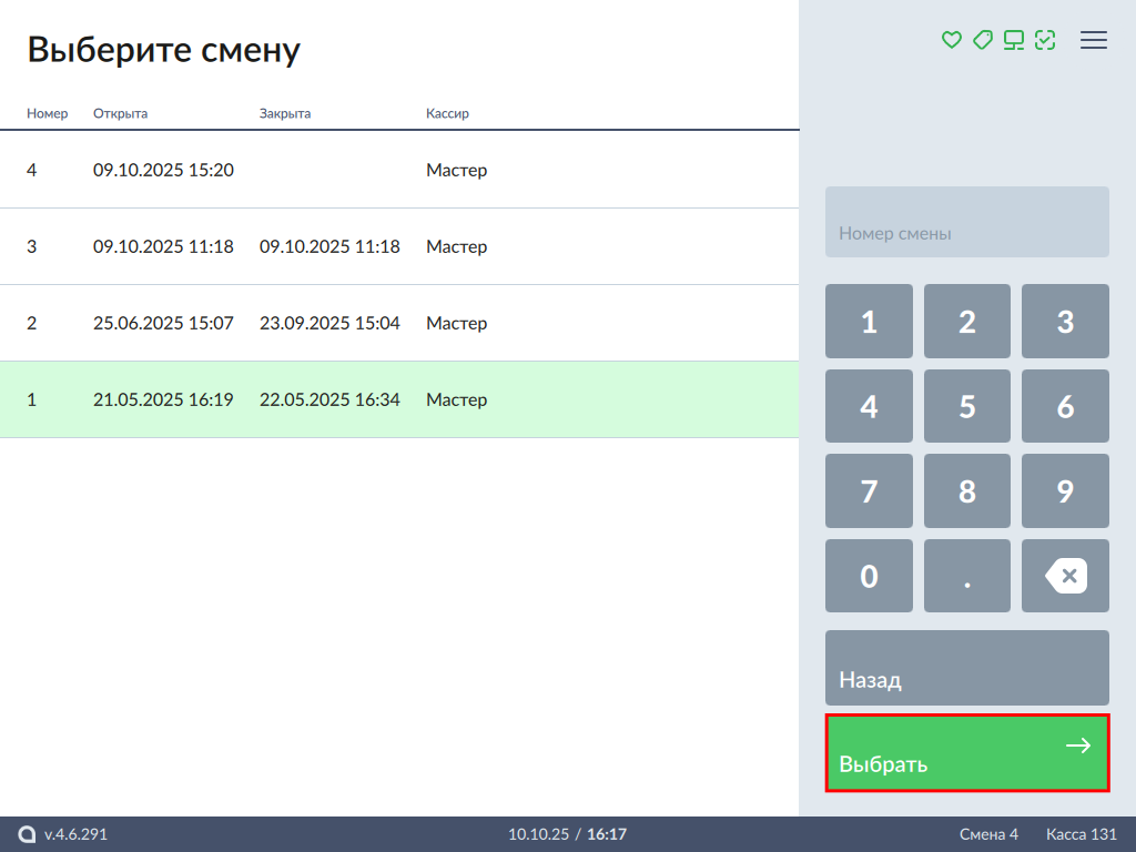 4. Перейдите к нужной смене и нажмите кнопку "Выбрать":