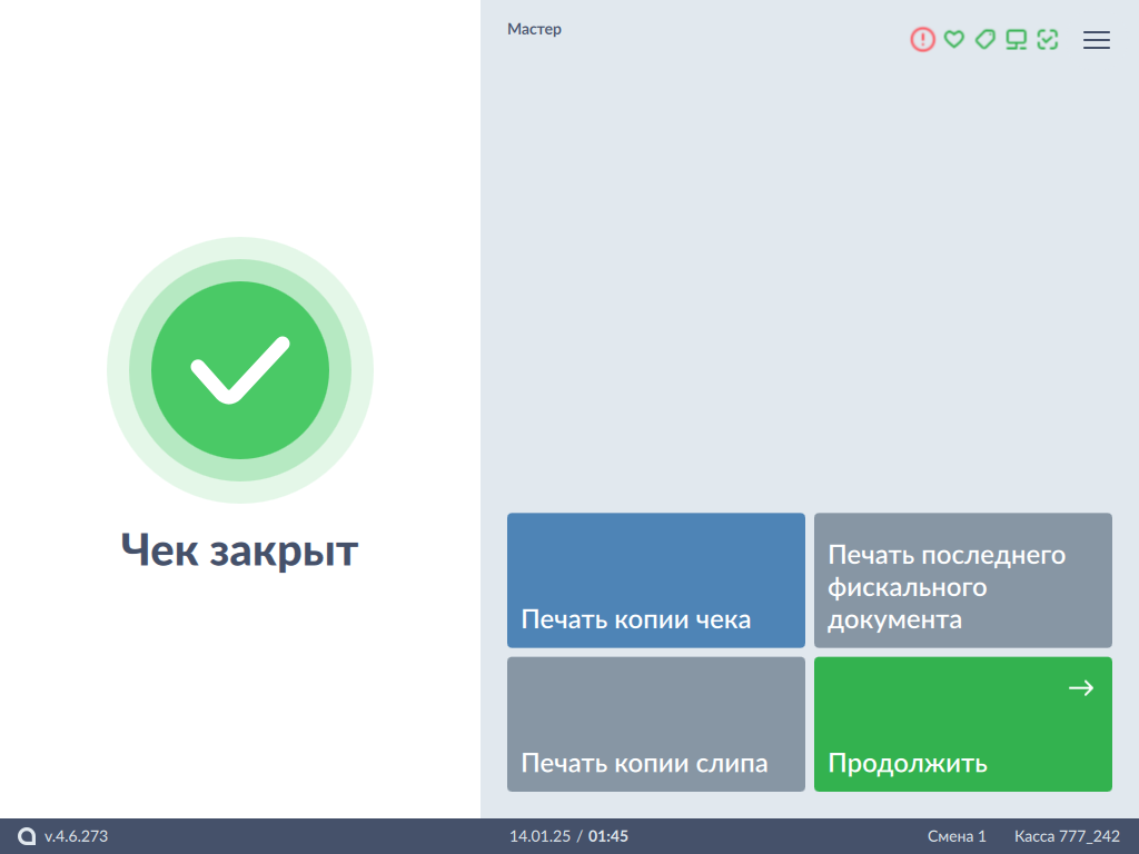 • Если в чеке нет сдачи, то он будет сразу закрыт.