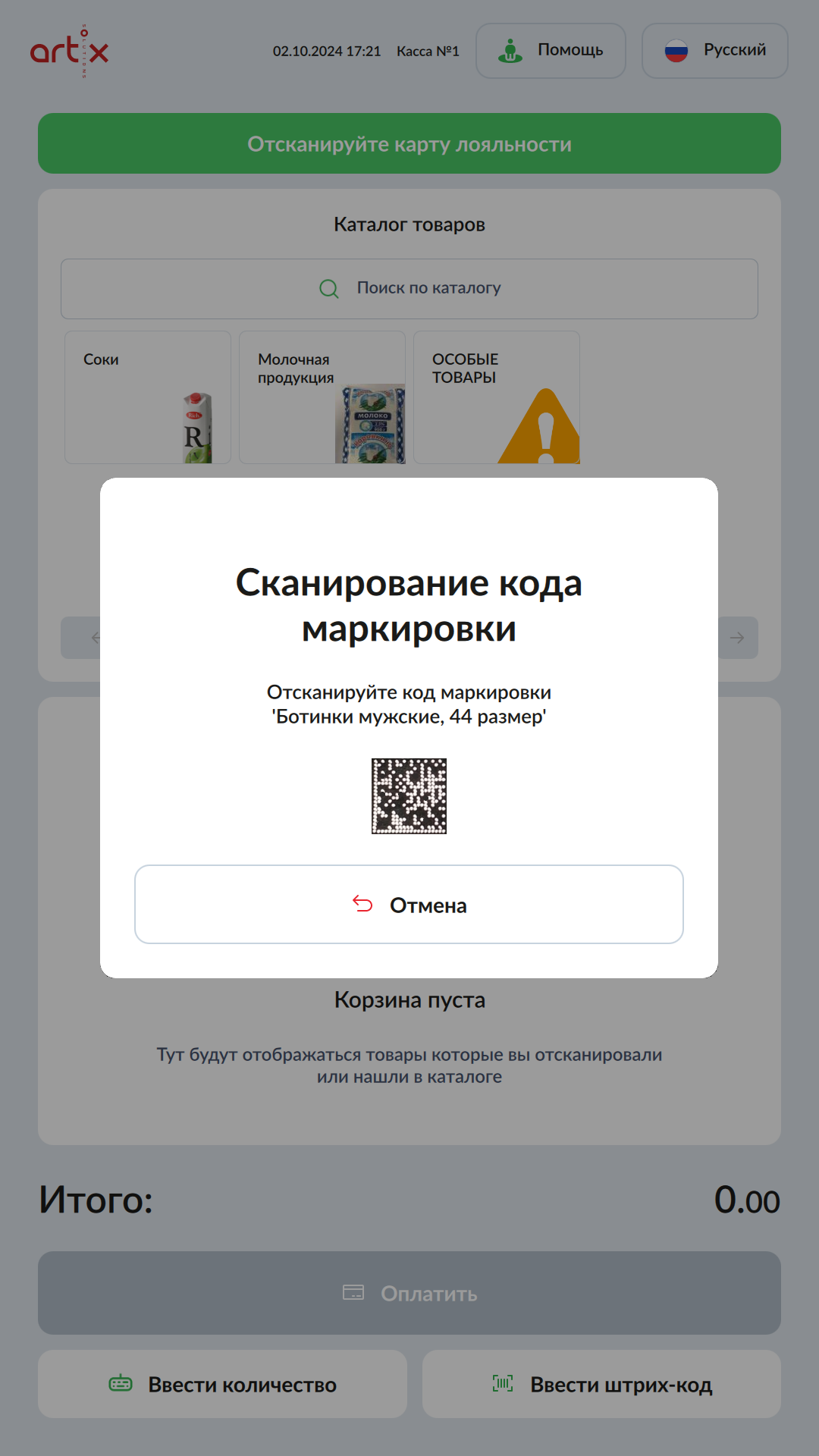1. После ввода штрих-кода/кода/артикула товара на экран будет выведен диалог сканирования кода маркировки: