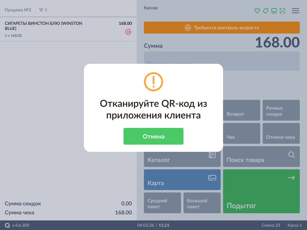 В режиме подытога будет отображено сообщение о проверке возраста с интеграцией MAX: