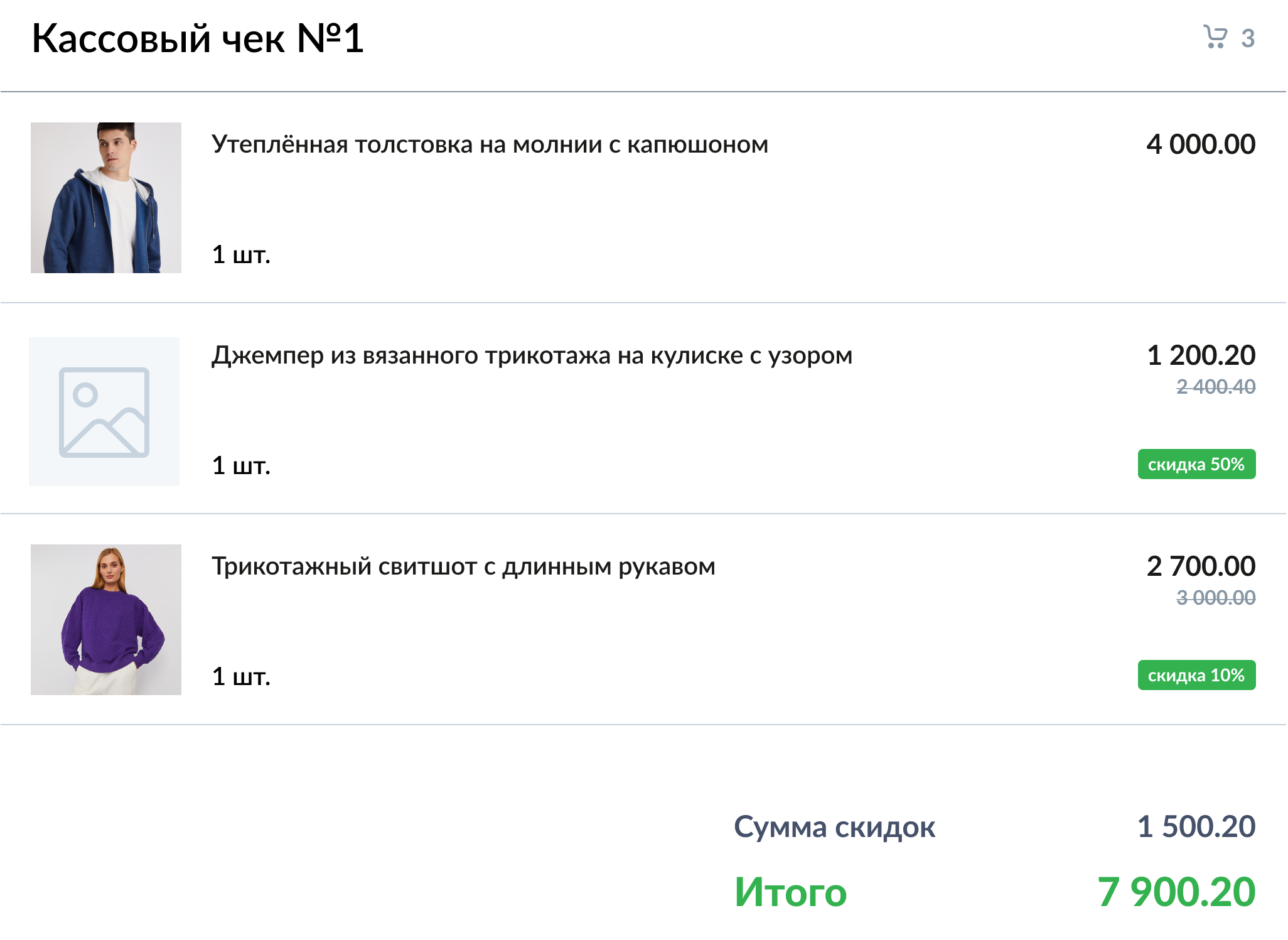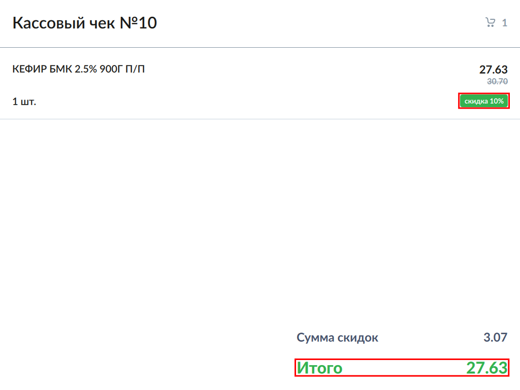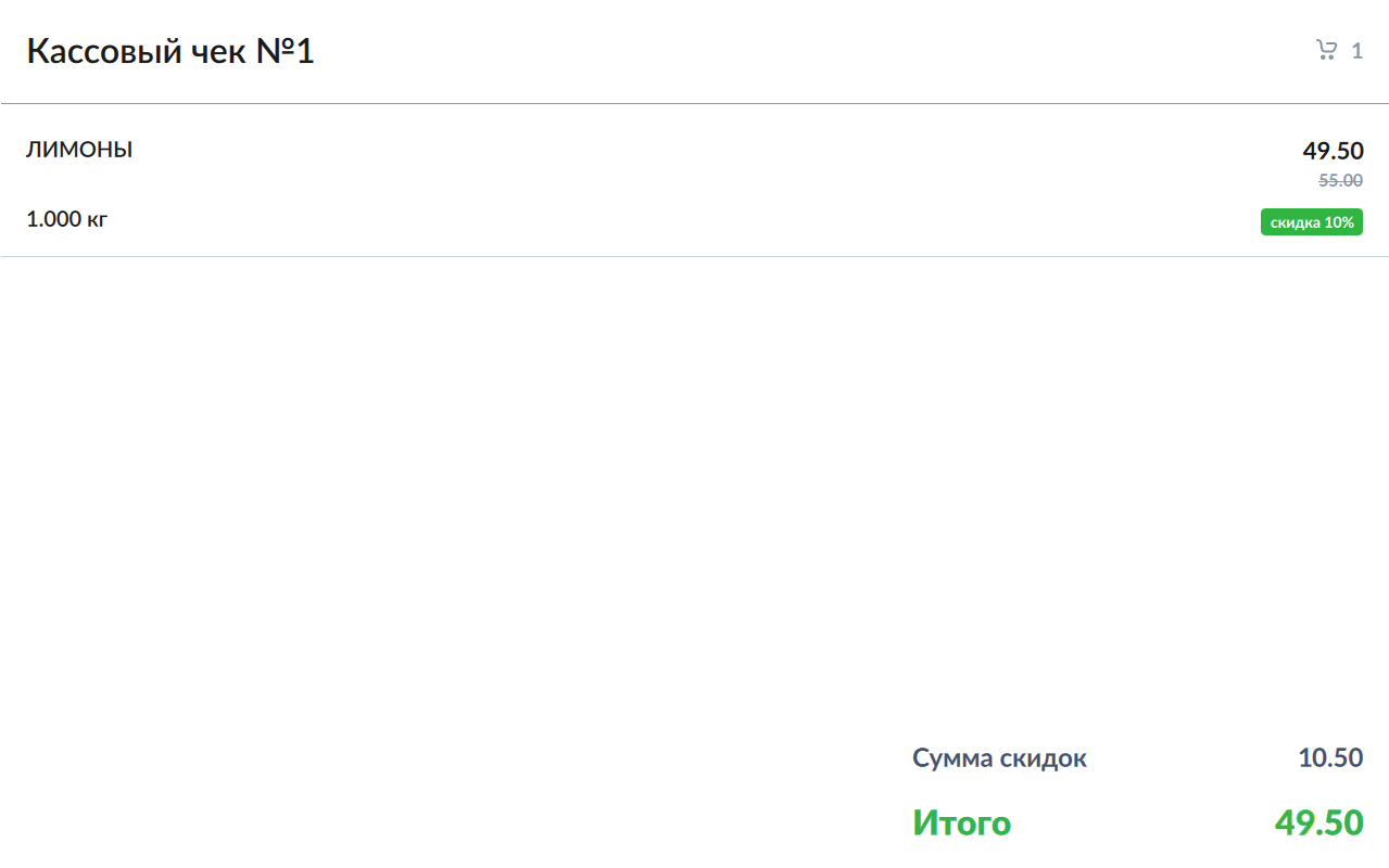 - Отображение процента скидки и "Итого":