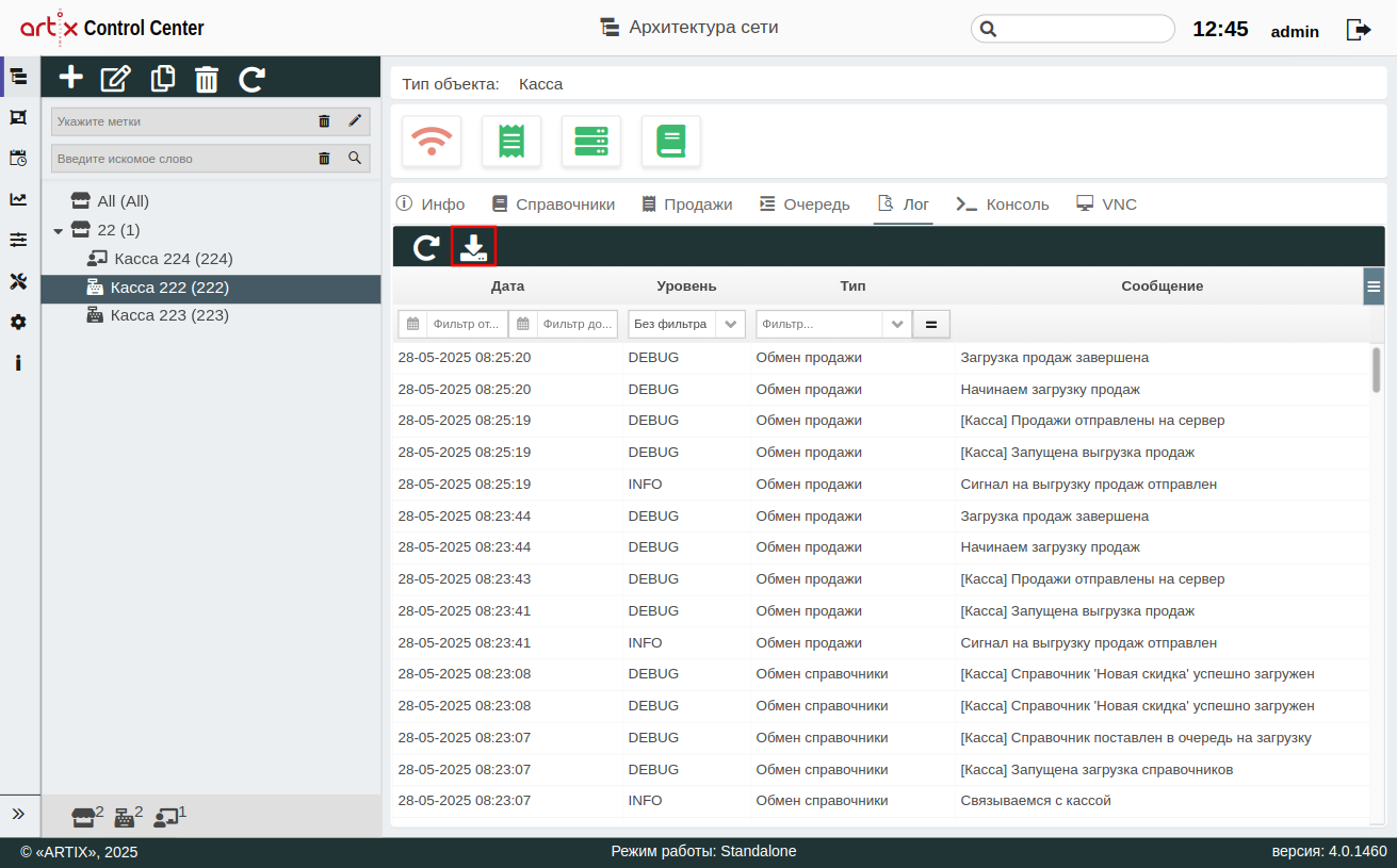 Будет выведено сообщение:Запись событий по загрузке продаж в Artix Control Center ведется во вкладке "Лог".