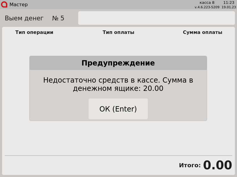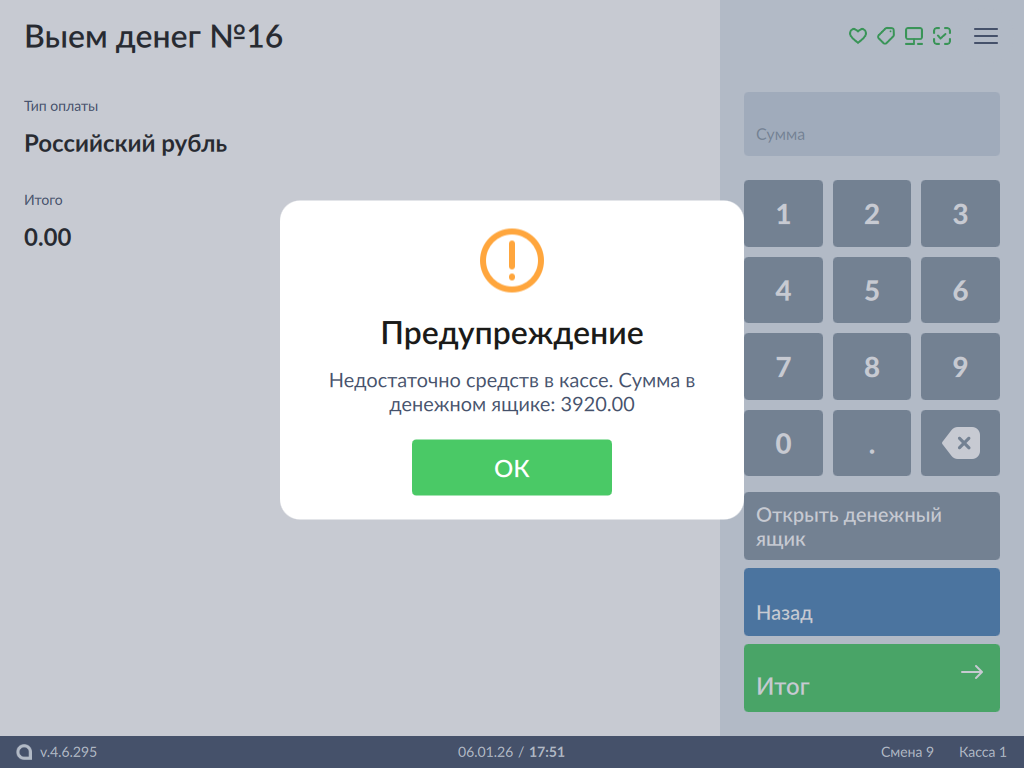 7 - Выем наличных. Недостаточно средств в кассе. Сумма в ДЯ.png